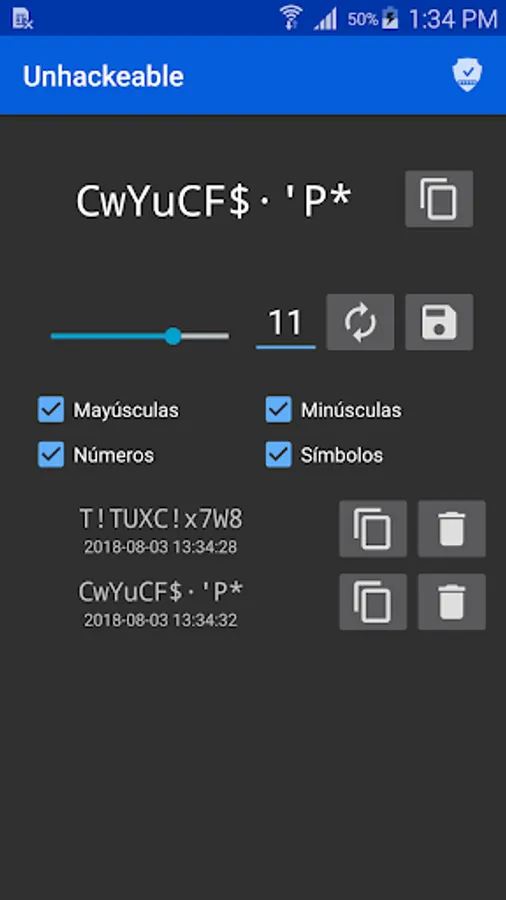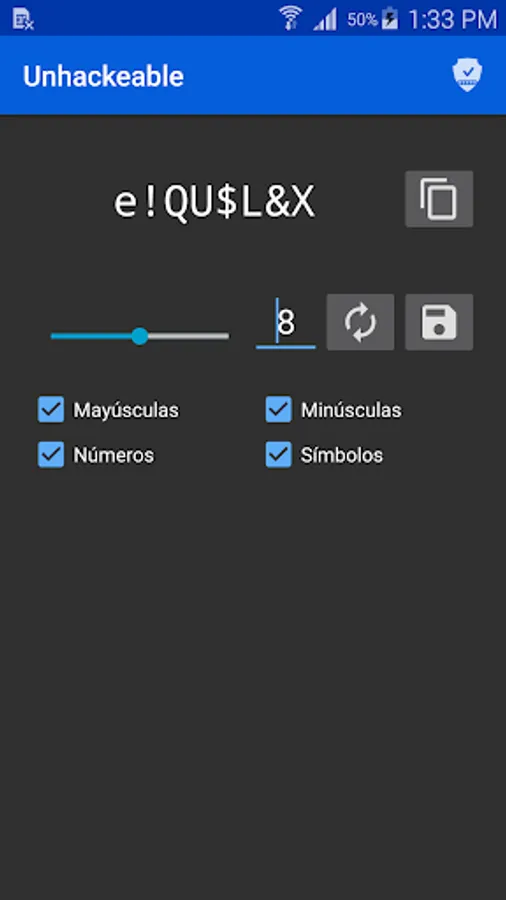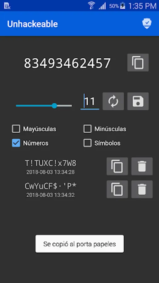 This app will help you generate the best and safest passwords for all your applications or websites where you require them. Enter the app and indicate what parameters you would like your password to take. The more options you select, the more secure your key will be.