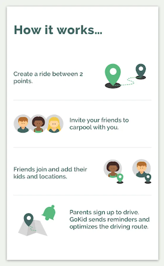 Available worldwide, the GoKid carpool app is not a taxi service for kids. It is a tool to help you keep your carpools with friends and neighbors organized and on track. With GoKid, parents take turns driving their own kids and their friends' kids.
