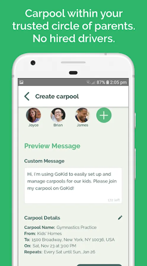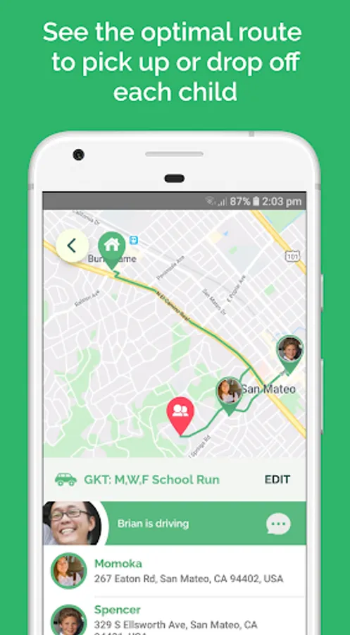 Set up your kids’ carpool schedule and then invite friends and neighbors; they join with their kids and each parent volunteers to drive on the days that work best for them. GoKid keeps the schedule organized in real-time, so the whole carpool group can see who is driving, where the pickups and dropoffs are, and what the best driving route is.