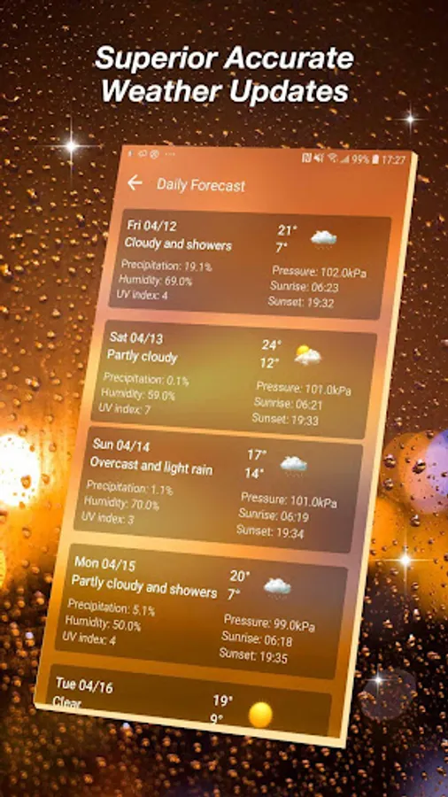 In this daily and hourly weather app, you can get more than just temperatures and clock. You can check humidity, visibility, UV index, air pressure, wind speed, sunrise time, sunset time in different units.