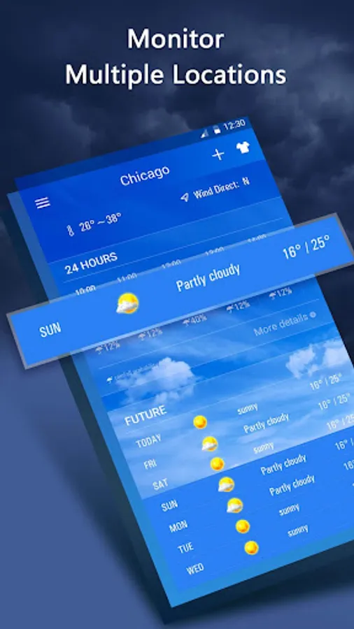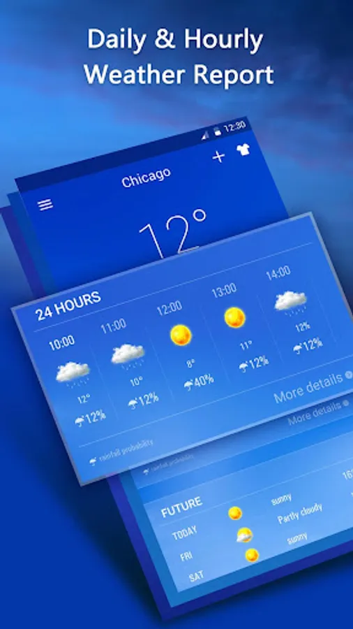 In this daily and hourly weather app, you can get more than just temperatures and clock. You can check humidity, visibility, UV index, air pressure, wind speed, sunrise time, sunset time in different units.