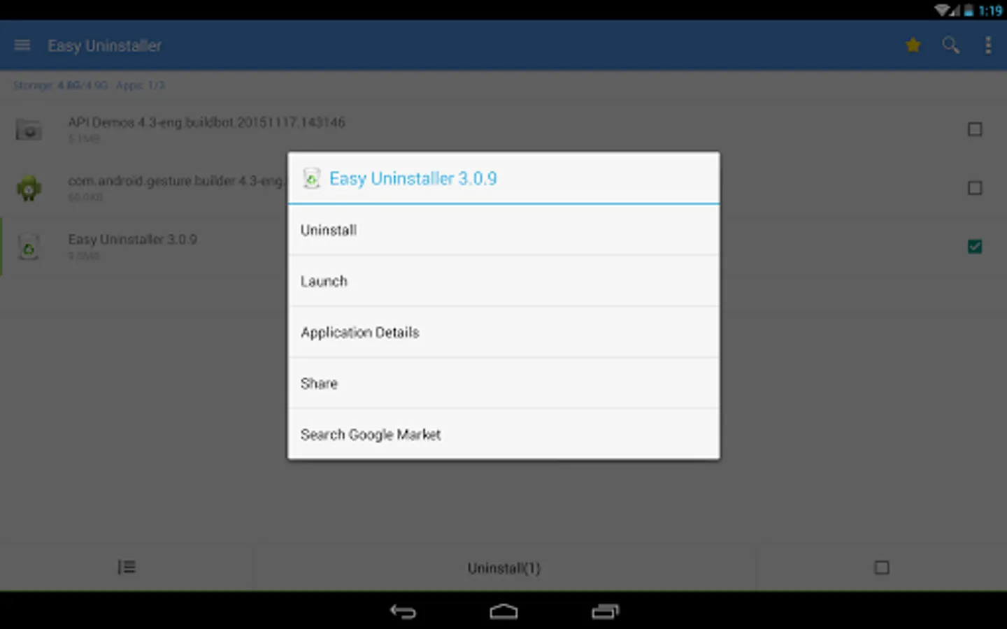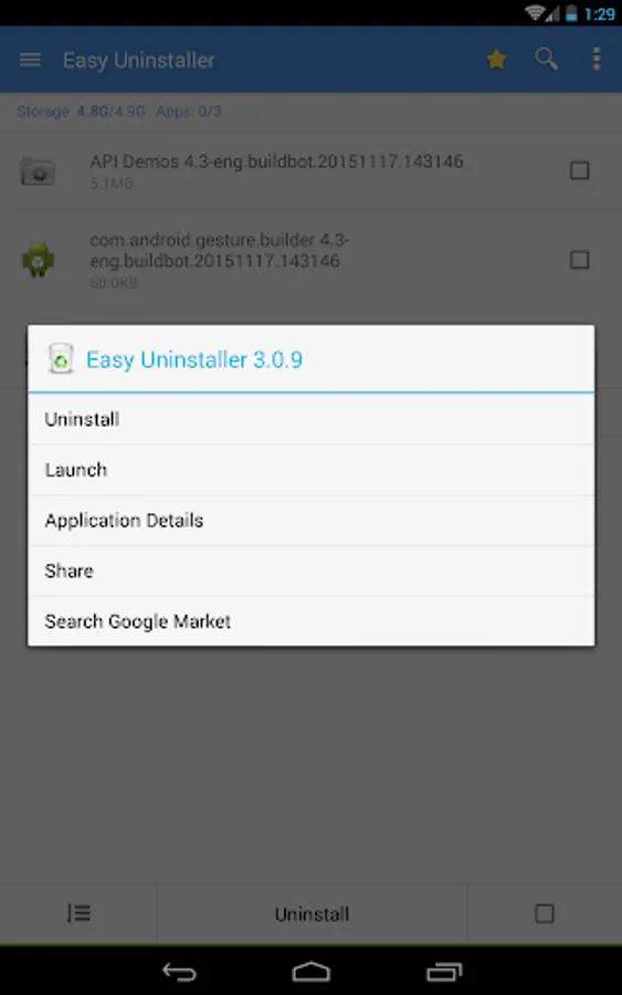 Long press specified app, a context menu will pop up and provide more options. You can view app details by clicking "Application Details". You can share apps by clicking "Share", and you can search the app in the Google market by clicking "Search in Google Market".