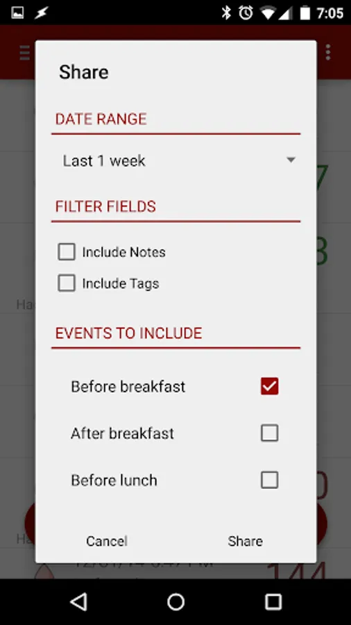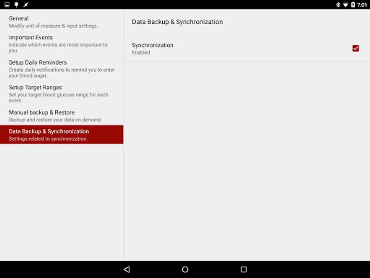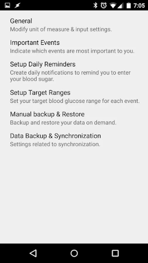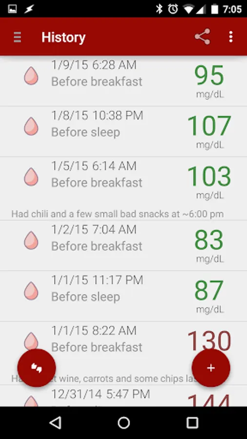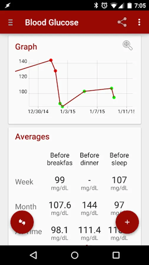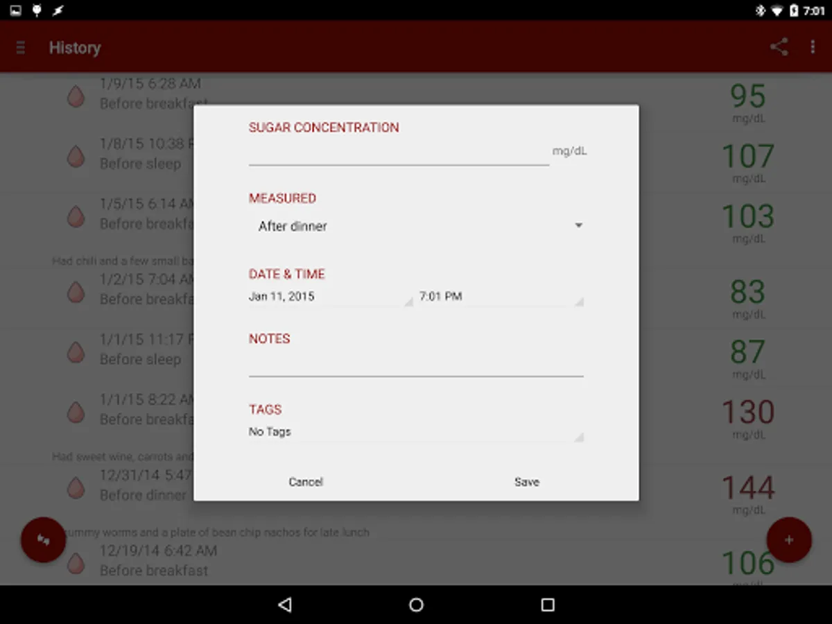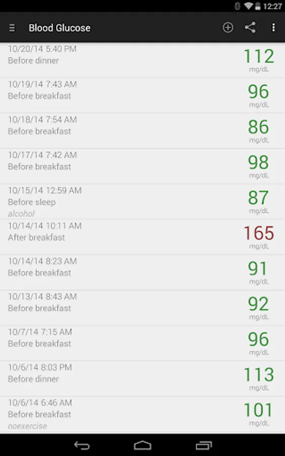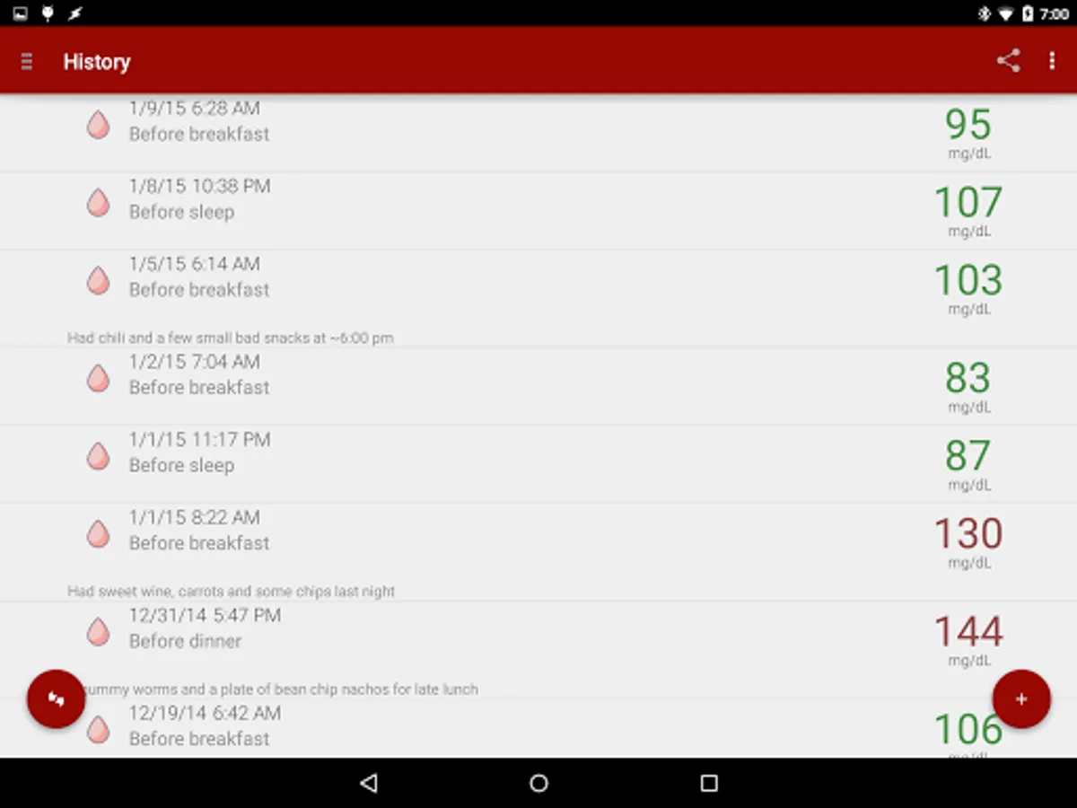 - Basic blood sugar tracking by type of event (before breakfast, before dinner, after lunch, etc.)