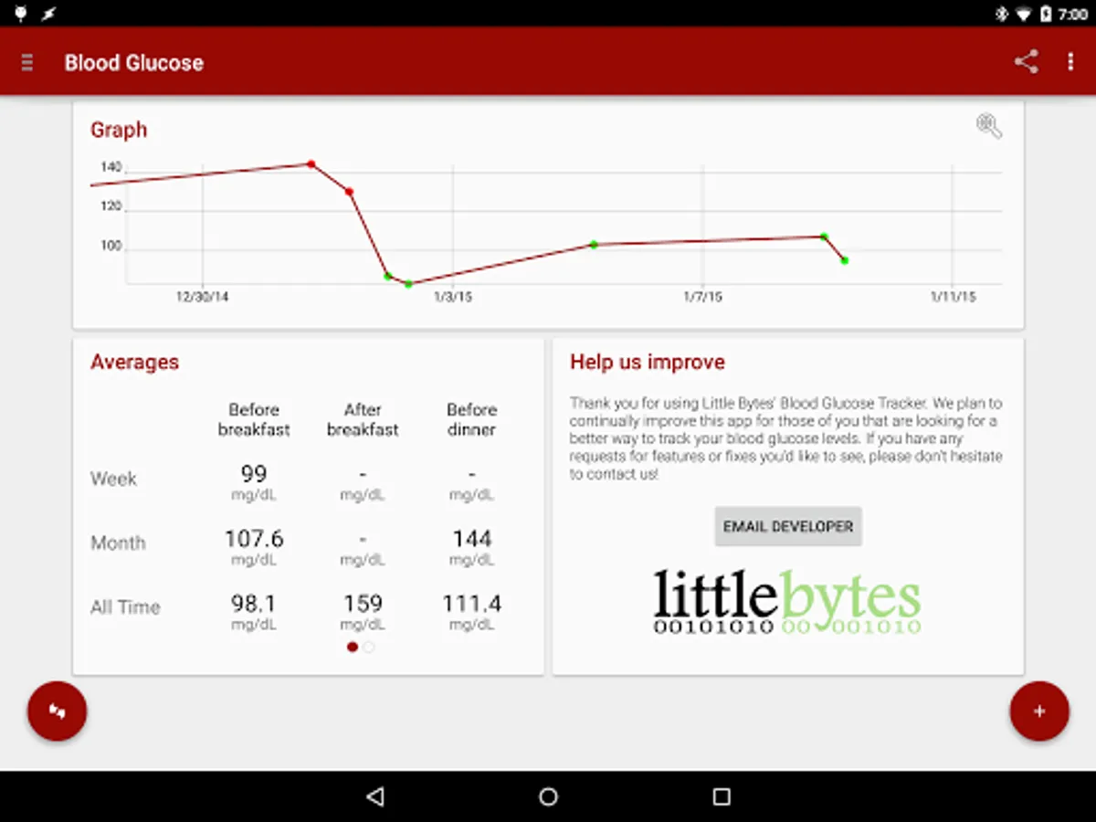 Blood Glucose Tracker by Little Bytes, makes it easy to log and analyze your blood glucose levels in a convenient place, your Android phone or tablet!