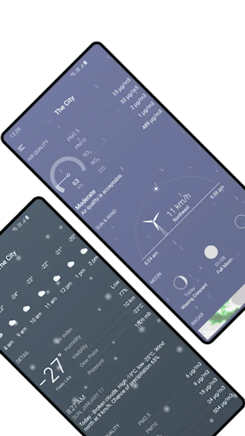 ● Air quality, uv index, humidity, visibility, dew point, air pressure, wind speed and direction.
