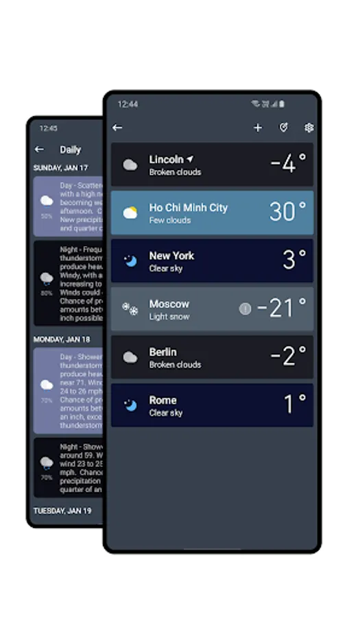 ● Multiple weather providers: National Weather Service (weather.gov), AccuWeather.com, Foreca.com, Weatherbit.io, Open Weather Map, Australia's official weather data (Bom.gov.au), Canada's official weather data (Weather.gc.ca), Yr.no, Smhi.se...