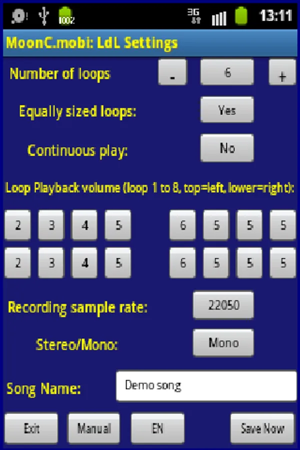 LoopDeLoop offers stereo/mono recording, selectable SampleRate, Loop naming, loop specific volume control and adjustable loop start synch.