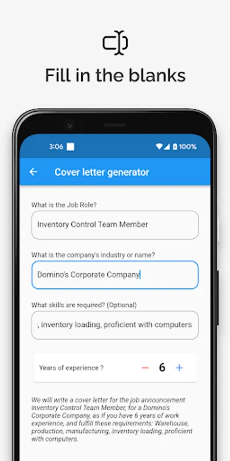 🖋 **Personalised Content**: With just four inputs—job title, industry, required skills, and years of experience—get a cover letter that's tailored for you.