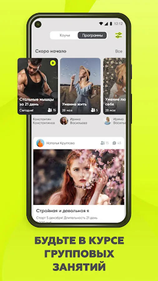 - View the entire list of coaches whose programs and workouts can be completed in the application. The opportunity to get acquainted with the price list for training with a particular coach and sign up for the right one.