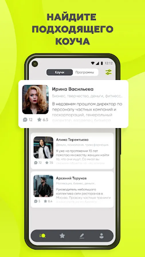 Any coach in the application, be it a personal fitness trainer, tutor or personal psychologist, is a highly qualified and educated specialist with a certificate that will help you see your own value and achieve results.