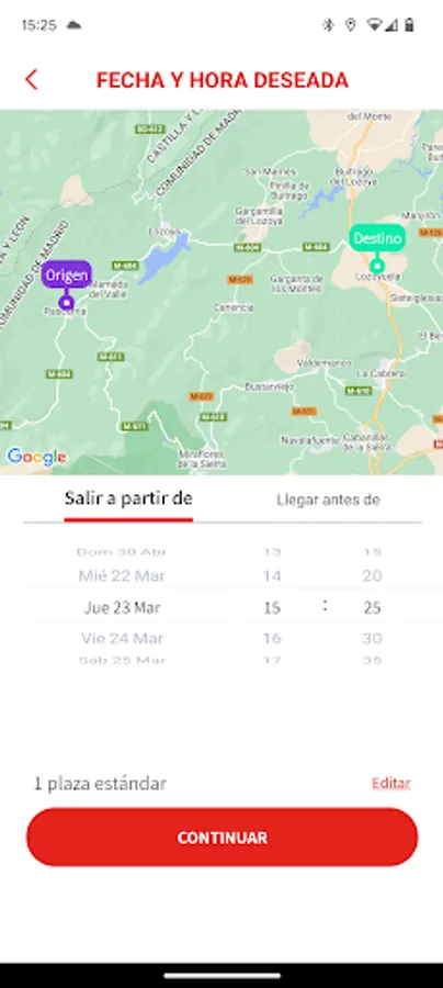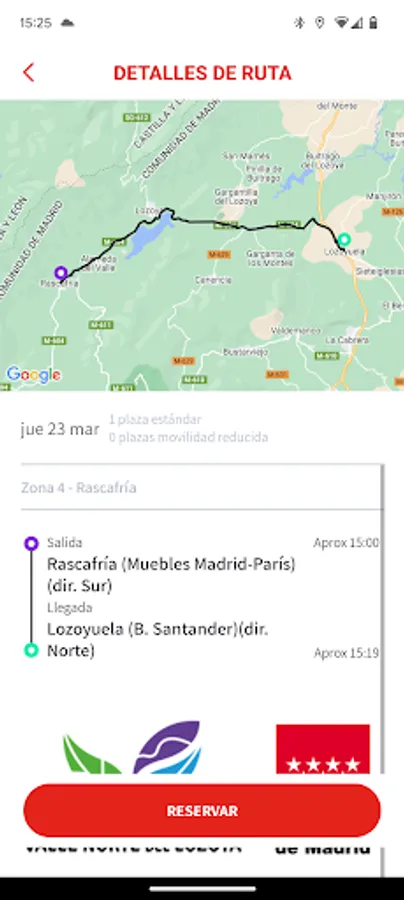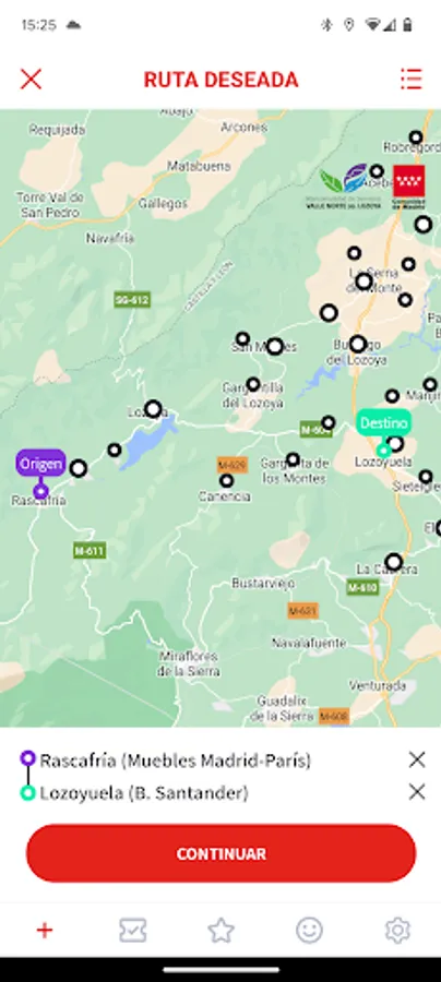 The new SierraCar app is free and allows you to book the on-demand transport service of the Sierra Norte de Madrid, selecting the desired day and time, as well as the preferred route (start and end stop).