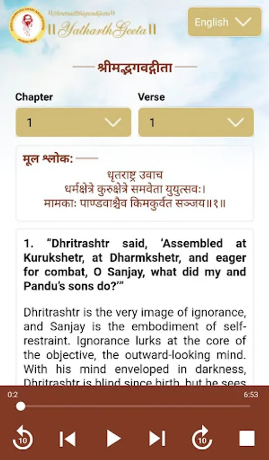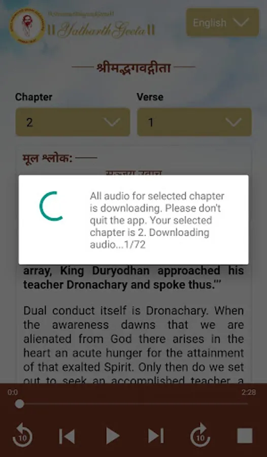 3. Audio Playback Options: Application contains Audio playback - ‘Auto Playback Shloaks’ and ‘Auto Playback Shloka Meanings’. As the user select the language, Audio of each chapter will be downloaded automatically. Listeners can then listen to 'Shlokas' along with 'it's Meaning'. Upon completion of the Shlokas/Meaning playback control automatically navigates to next shloka/meaning.