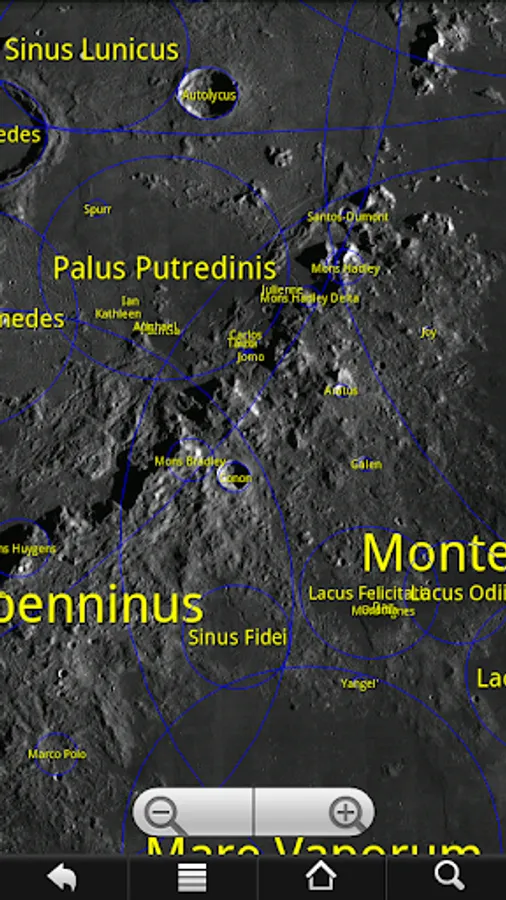 - Searchable labels for over 8950 craters, maria, mountains, valleys, Apollo landing sites and more, based on International Astronomical Union data; tap on feature for more information or to lookup in Wikipedia