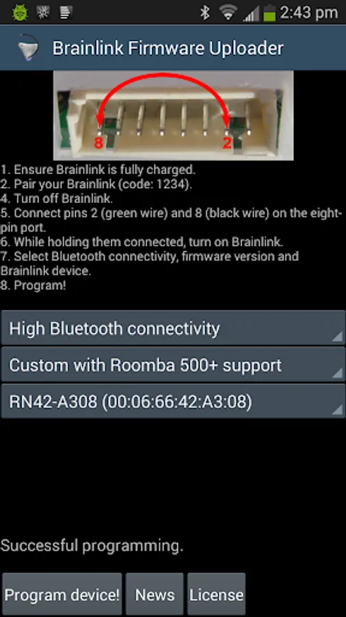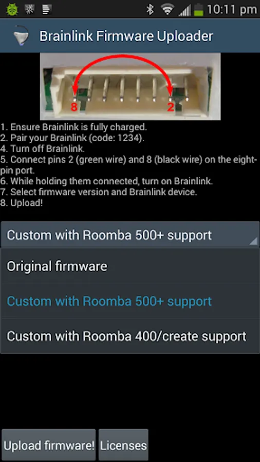 This is an easy-to-use unofficial uploader for some unofficial firmwares for a Brainlink device. The unofficial firmwares allow the Brainlink to function as a pass-through serial-to-Bluetooth link, with special optimizations for Roomba and Mindflex devices. With the custom firmware, the Brainlink can function as a regular Roomba-to-Bluetooth link, compatible with many Roomba remote control apps (just make sure you choose the firmware depending on which Roomba model you have). The firmwares are designed to be backwards compatible with the Brainlink OEM firmware, which is also included so you can downgrade back.