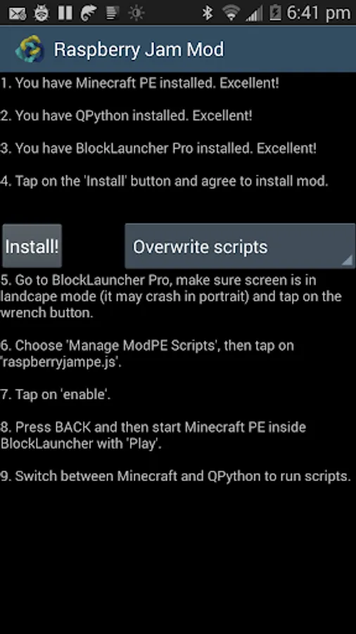 This mod requires three other ingredients: (1) Minecraft PE, (2) BlockLauncher (or BlockLauncher Pro) and (3) QPython.