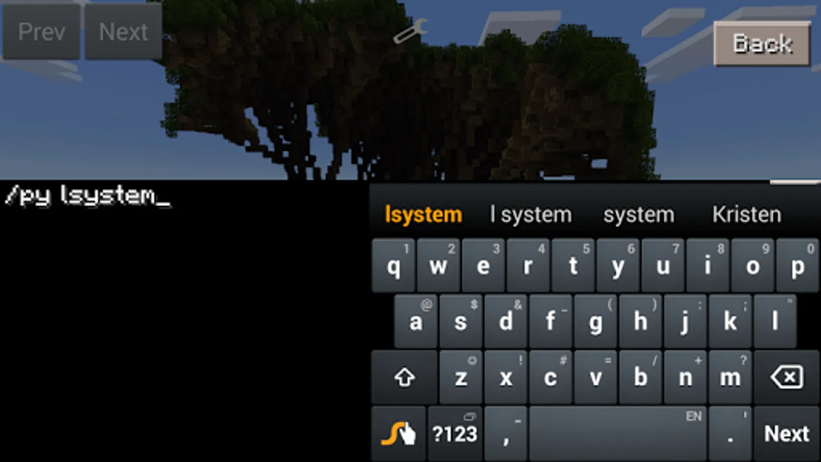This unofficial mod for Minecraft PE implements most of the Raspberry PI Minecraft API, allowing Minecraft PE to be controlled by Python code. The package also includes a number of sample Python scripts, including chess (play chess against your device in Minecraft; the script automatically downloads the Sunfish engine).