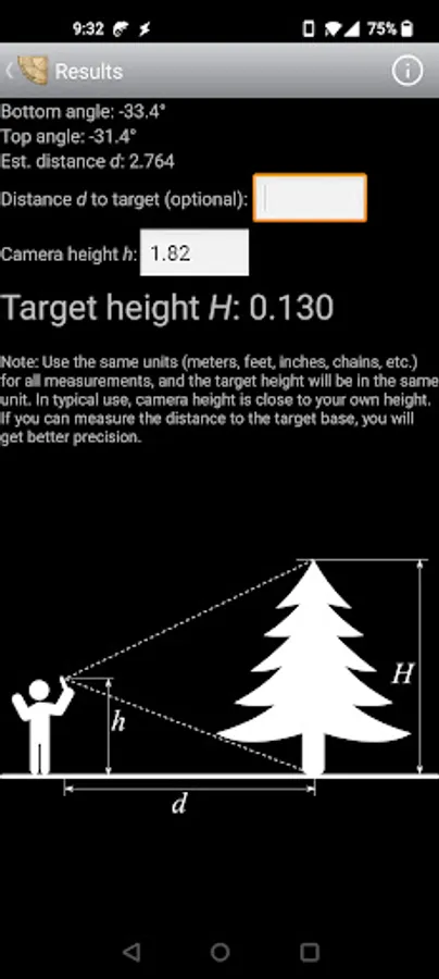 Quickly measure the heights of buildings, trees, stomp rocket flights, etc., by first pointing the camera at one end of the object and then the other. Doubles as a simple camera clinometer that can use either the back or the front camera.