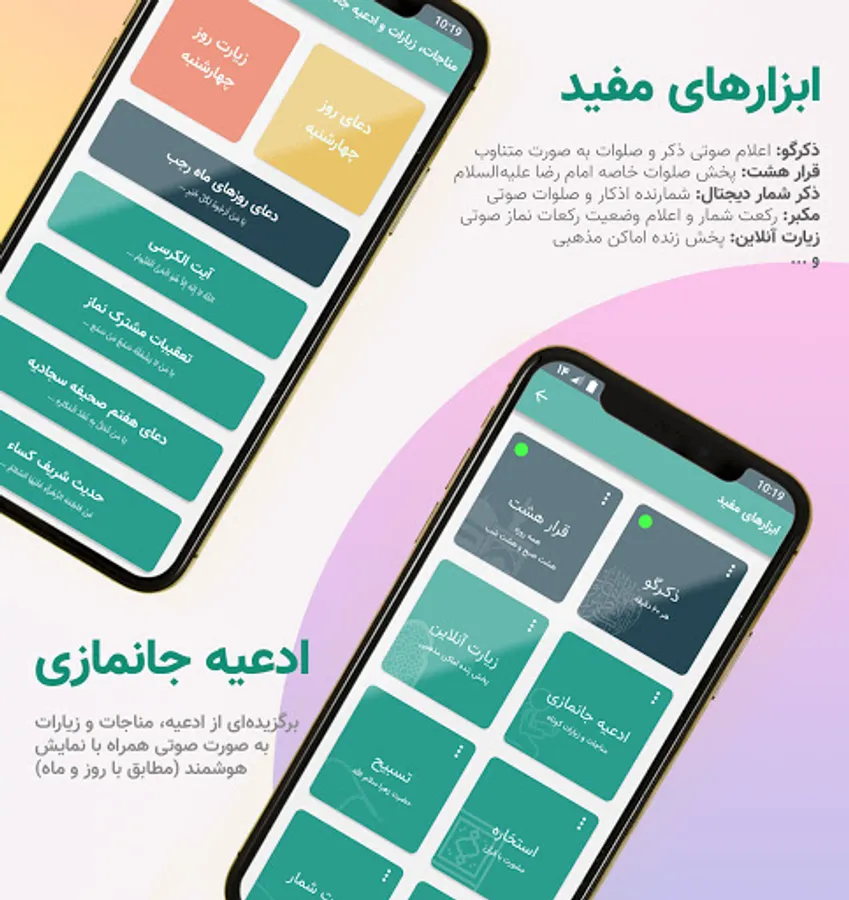 آیت الکرسی، تعقیبات نماز، دعای هفتم صحیفه سجادیه، حدیث کسا سلحشور، دعای توسل، زیارت امین الله، زیارت عاشورا مطیعی، صلوات خاصه امام رضا مرحوم انصاریان، دعای عهد، زیارت آل یاسین، دعای سحر با صدای مرحوم صالحی، دعای فرج و سلامتی امام زمان، مناجات امیرالمومنین در مسجد کوفه با امکان حرکت متن همزمان با صدا