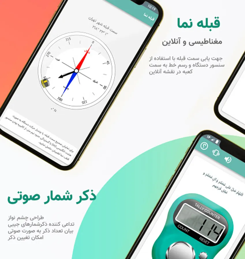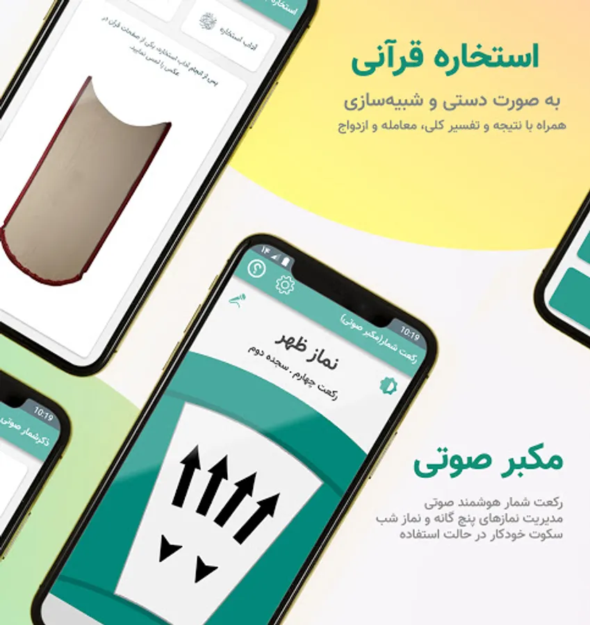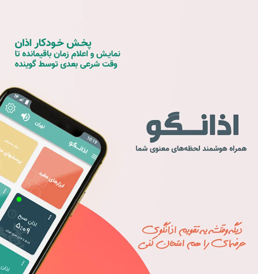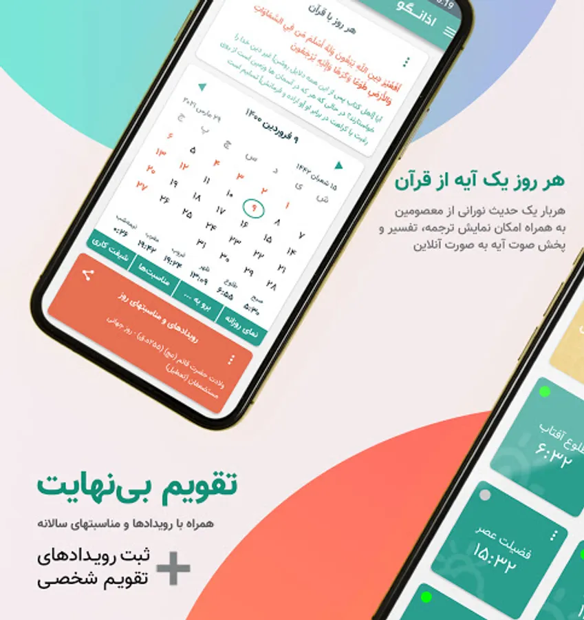 پخش اذان با صدای موذن های برتر از جمله موذن زاده، آقاتی، صبحدل، کاظم زاده (اذان انتظار)، طوخی، غلوش و ... و امکان انتخاب اذان دلخواه از حافظه دستگاه به همراه تنظیمات و شخصی سازی