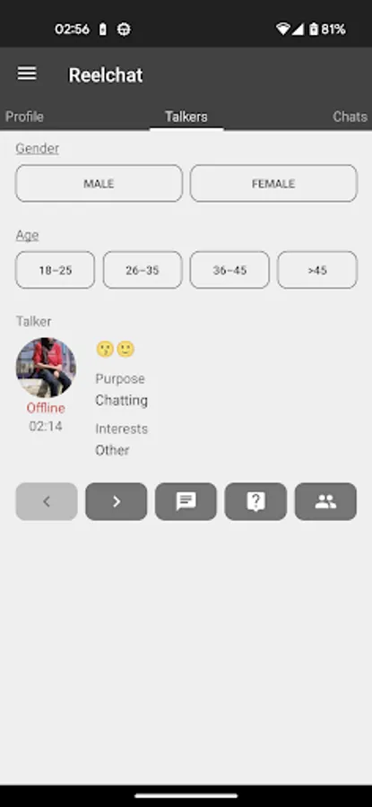 Fill your user profile, define the search criteria for a talker and the application will search an appropriate talker, who is online.