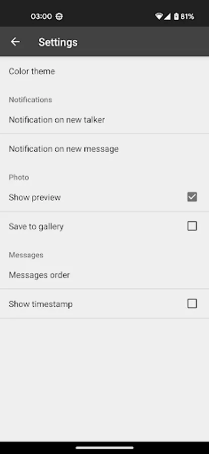 By default, only text messages are permitted. Photo and audio messages talkers permit each other for each chat.