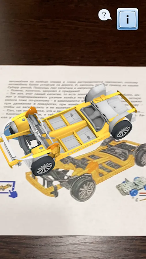 To activate the features of augmented reality, install this application on a smartphone or tablet. Open the application, click the "Start" button. Find the pictures in the book next to which a blue tablet is drawn, and point the camera at them. A cover picture with a secret: you can start the car engine or turn on the headlights by touching the icons in the application.