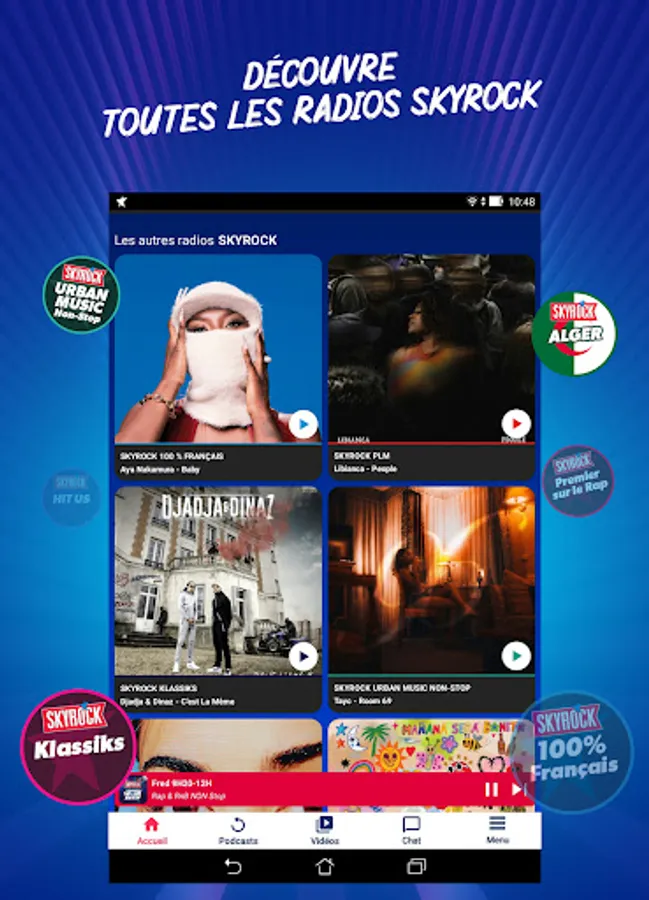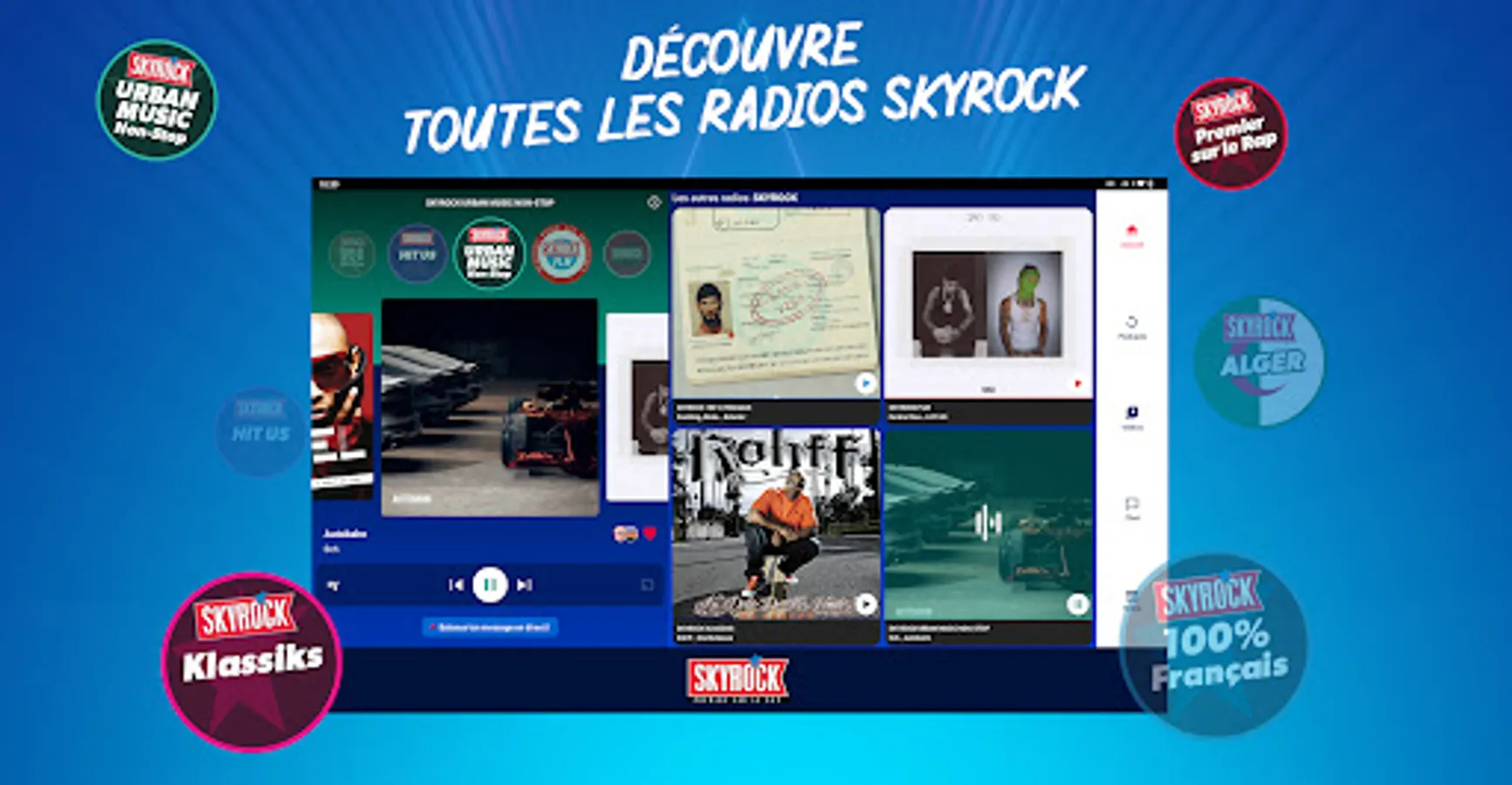 • All Skyrock radios: choose your style and listen to even more great sounds. Urban Music Non-Stop, 100% French, Klassiks, and many others, there is something for everyone!