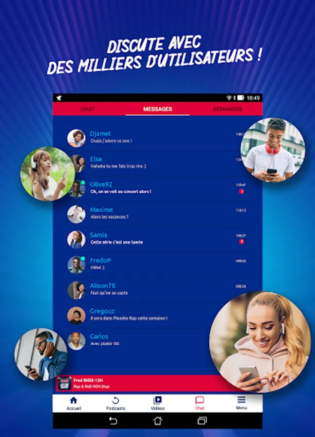 • Send your message to the air: react live to broadcasts, the messages you send are displayed in real time in the studio!