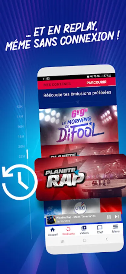 • Podcasts and offline mode: to re-listen to your favorite shows, where you want, when you want.
