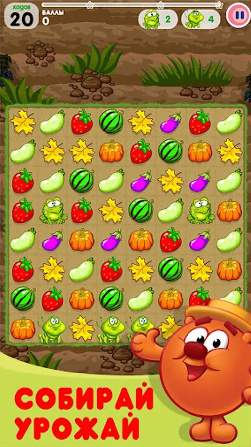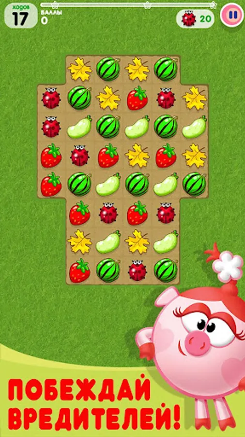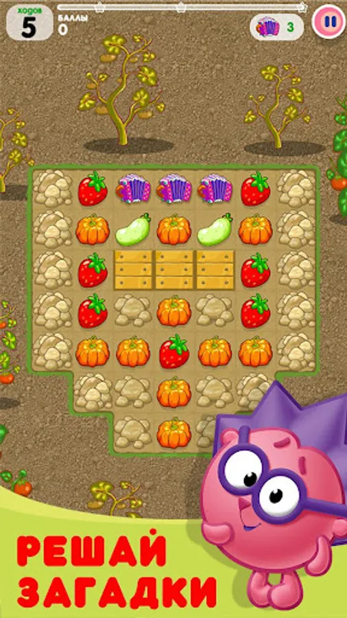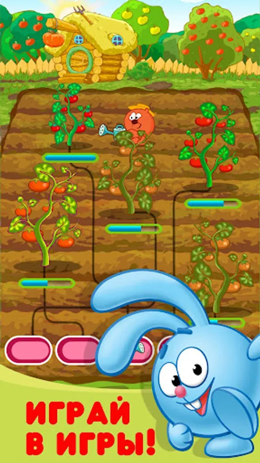 Take part in an exciting game Smeshariki and help cope with the harvest! Collect fruits and vegetables, drives away pests, find lost things in the garden and to involve other Smeshariki!
