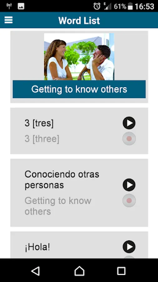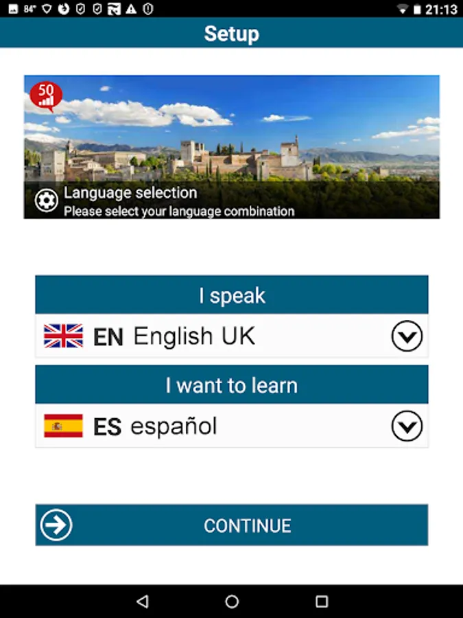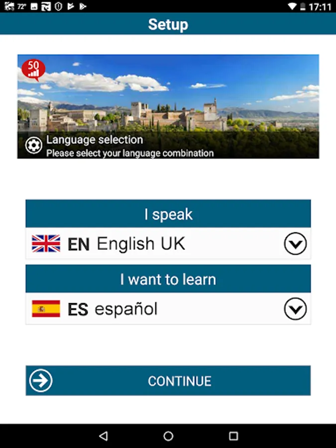1. In the Main Menu tap on "Select languages". Then select your native language and the language you want to learn. Stay online for 10 minutes so that all sound files for this language can be downloaded in the background. You can work offline then.