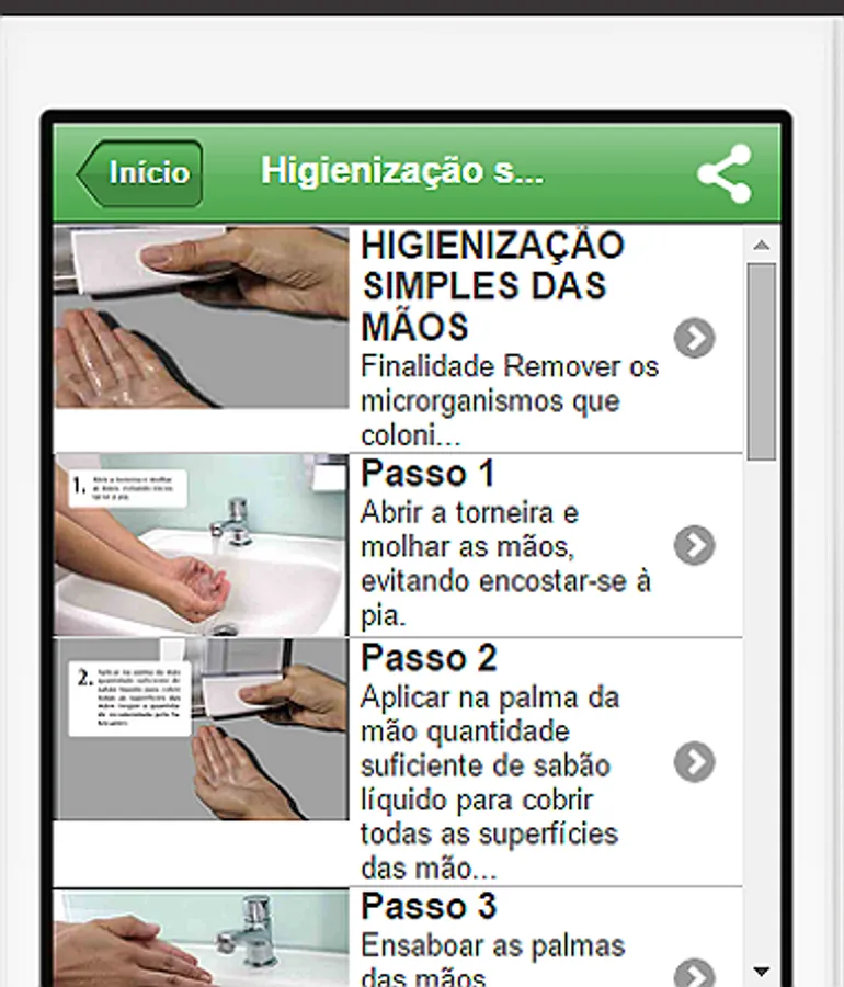 The educational application on hand hygiene in health services was developed based on the manual of the National Health Surveillance Agency. It is a compilation of illustrated content that will help health professionals to properly perform hand hygiene techniques, at the appropriate times, with the right products for each moment, corroborating to reduce the risks of assistance to patients / clients of the our country. The data compilation was performed by the technical manager of Bem Cuidar Desenvolvimento, nurse Maximiliano Dutra de Camargo, a researcher at the Study Group on Information Systems and Telehealth (GESIT), at the School of Nursing at the Federal University of Rio Grande do Sul.