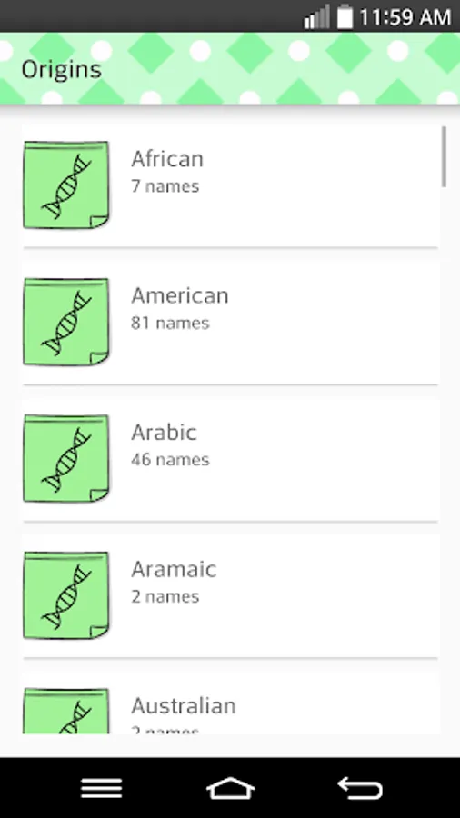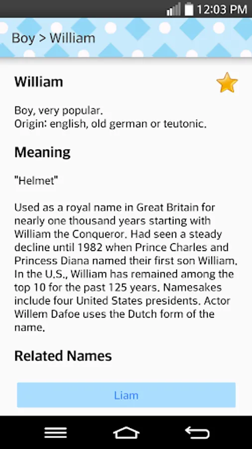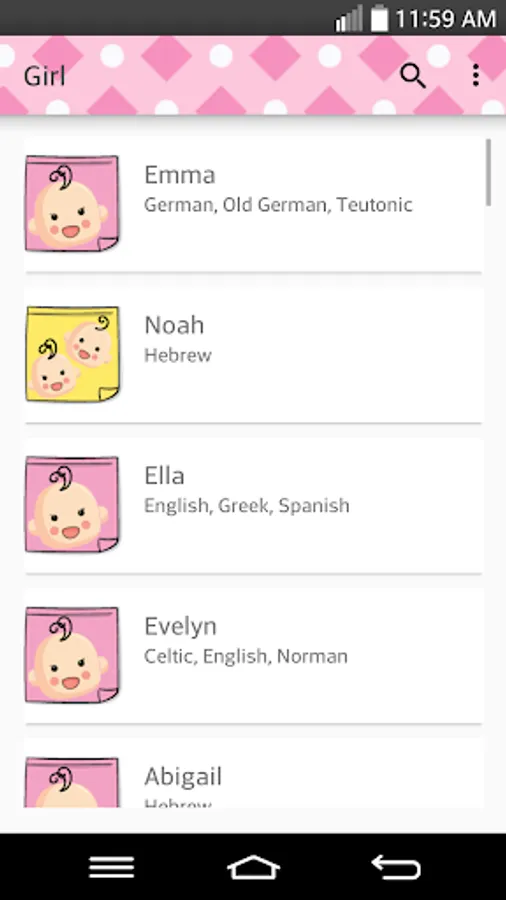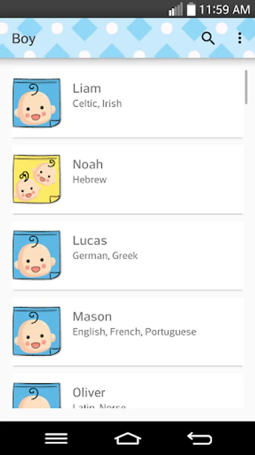 With this app, you have easy access to a database with more than 3,000 names (and growing...). For every name you have the meaning, origins and popularity level (popular, median or rare).