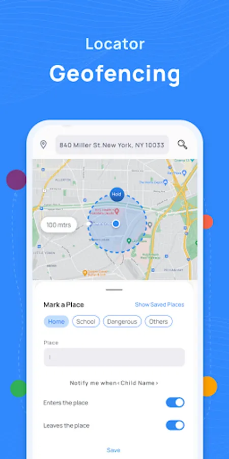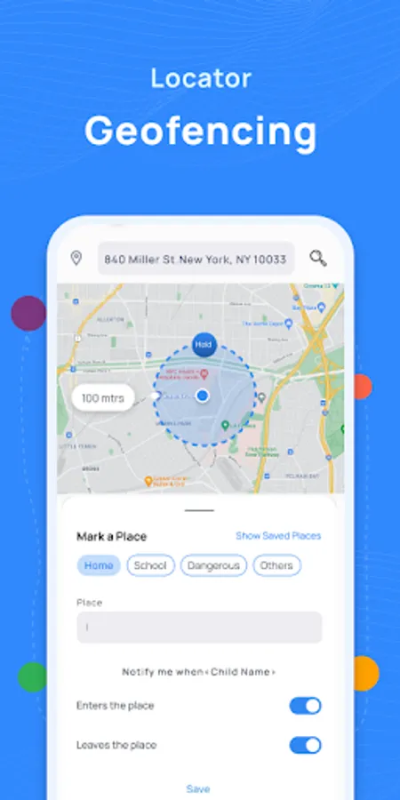 • Geofencing: Create GPS geofences around locations and get alerts when your child leaves or arrives at home, school, or any marked place.