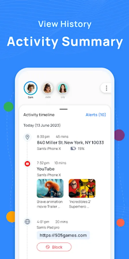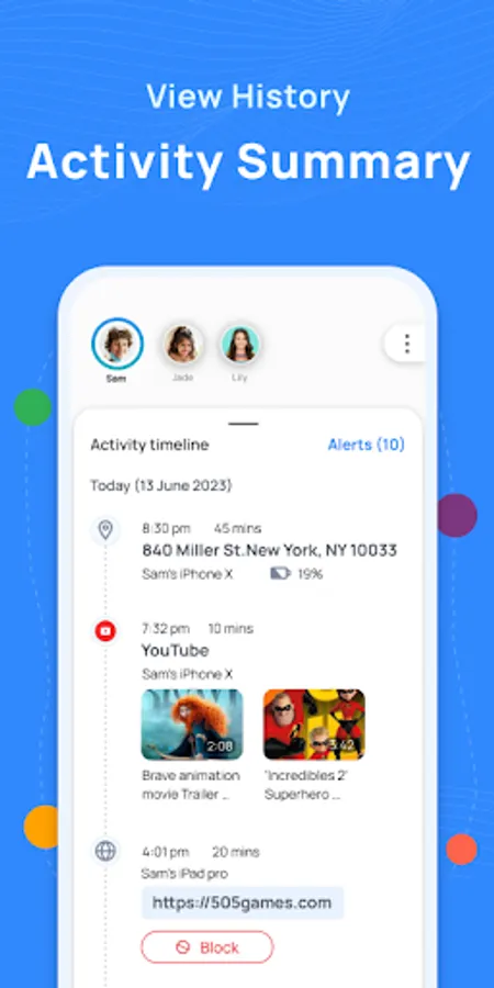 • Activity summary: Keep track of how your child spends their time online with a 30-day reporting history.