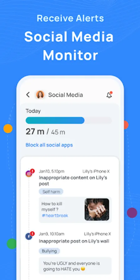 • Monitor social media: Get alerts on harmful conversations on Facebook and Instagram and prevent cyberbullying and predatory attacks.
