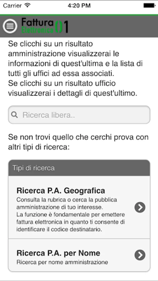 The app also allows you to search for the various administrations and offices of the PA and return codes recipient.