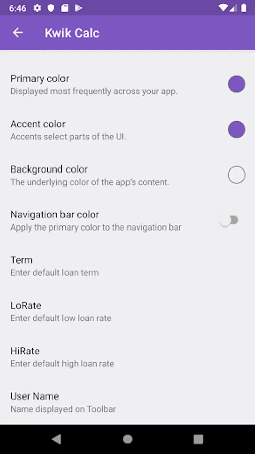 You can personalise KwikCalc by selecting pre-set Themes or defining your own display colors. You can also have your Name or your Company Name displayed on the Home Screen.