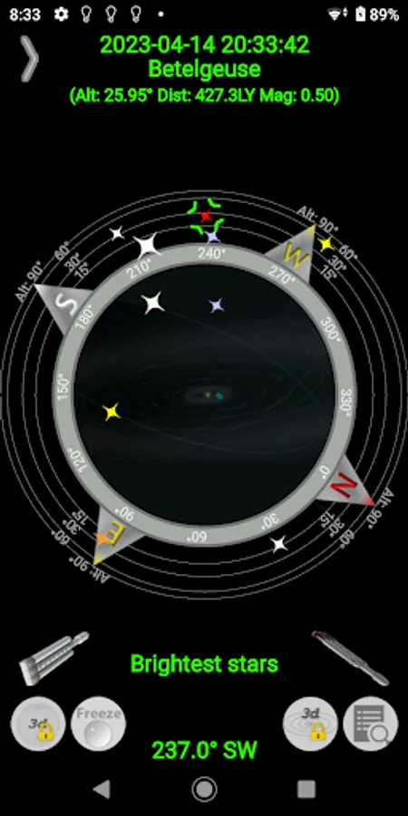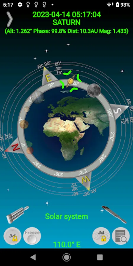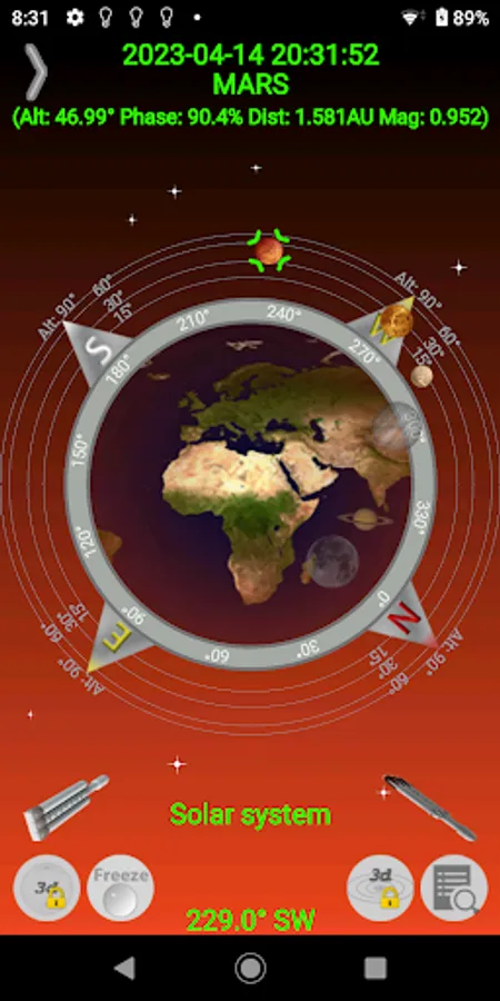 It's extremely easy! Just launch the application to obtain an instant overview of the planets surrounding you. You're in a geocentric position in the middle of the screen, on Earth, and the planets are being displayed around you. If a planet is above the Compass Ring and is highlighted, it's visible. If the planet is below the Compass Ring, towards the center of the Earth, it is shadowed and below your horizon. The same applies to all the other celestial bodies types.