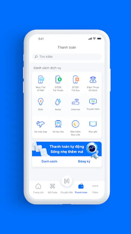 - Thực hiện thanh toán các loại hóa đơn, dịch vụ như Điện; Nước; Internet; Truyền hình; Điện thoại cố định; Điện thoại di động trả sau