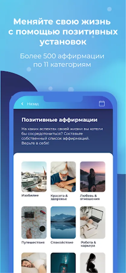 Take your life into your own hands. Change. Get better. An application that allows you to create a list of your own meditations and affirmations, add them to your calendar and receive notifications do not forget to love yourself, be healthy and strive for success.