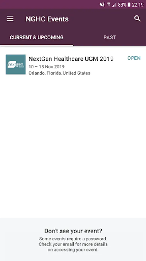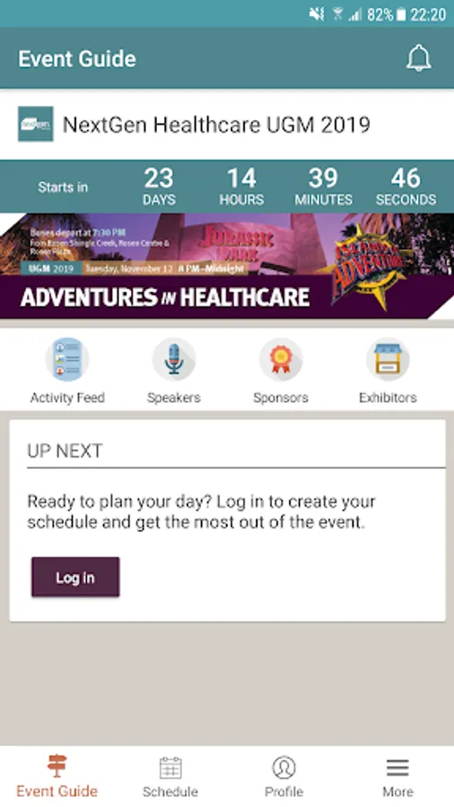 Mobile app used for NextGen Healthcare's 2019 Annual User Group Meeting. Attendees can use the app to build their schedules, network with peers, and learn more about the event. Exhibitors and Sponsors are also highlighted on the app.