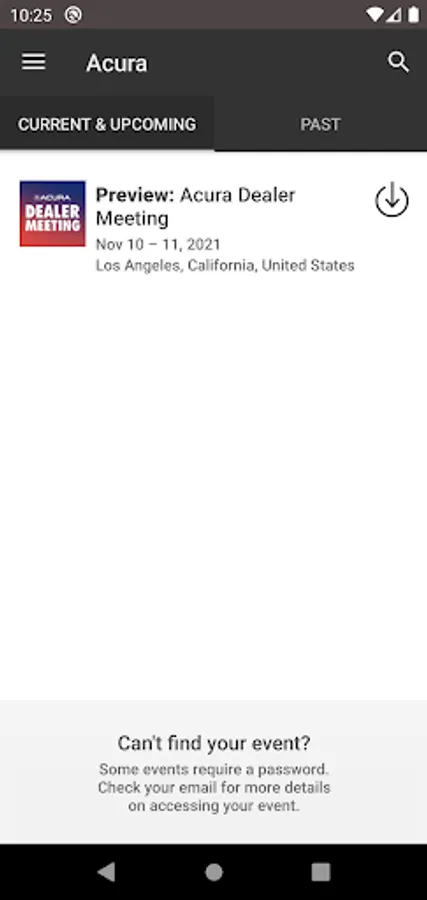 The Acura Events app supports Acura Domestic/ North America events. Only invited attendees may access the application, which will serve as a mobile resource for the event. The app includes a schedule of events, list of attendees, maps, and other important information.
