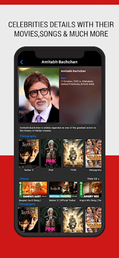 ● Celebs details - birth date, movies, videos, synopsis, etc
