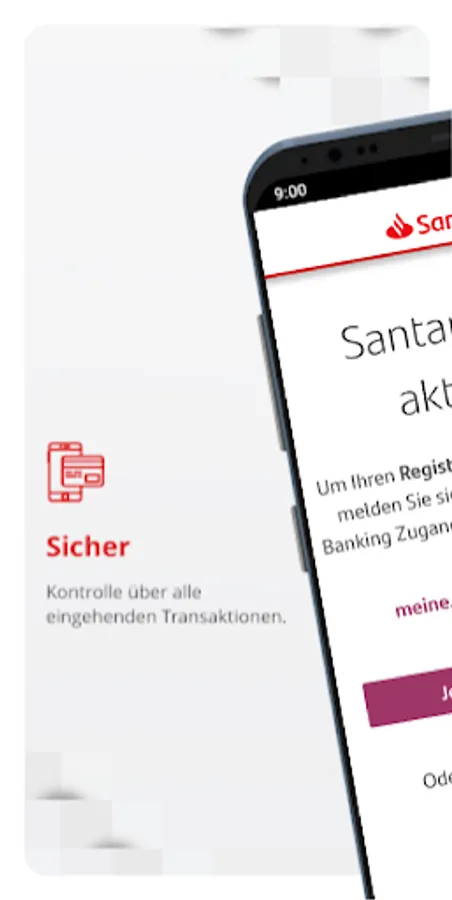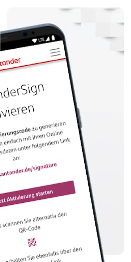 The SantanderSign app is used to release orders from online banking for Santander customers in Germany. Transactions made in online banking or with the mobile banking app are displayed in the SantanderSign app as a transaction to be released and can be released using fingerprints, facial recognition or by entering a personal password. Download the SantanderSign app and the mobile banking app onto your smartphone and be flexible in carrying out your banking transactions on the go. You need your online banking access data to activate it.