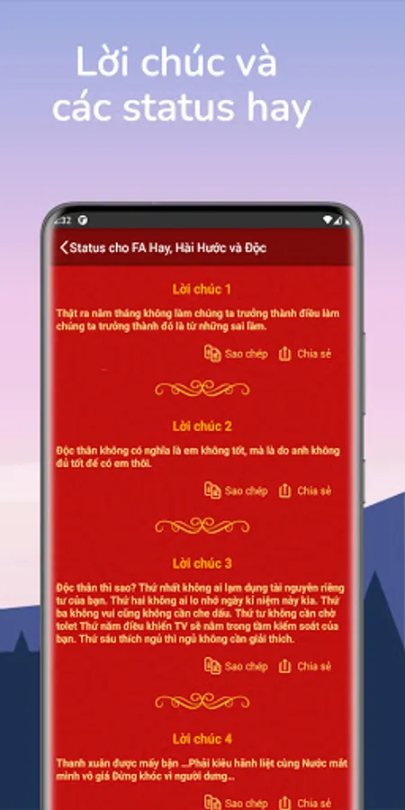 This application synthesizes good and meaningful New Year wishes to give your friends, brothers/sisters, colleagues, parents, spouse, girlfriend...