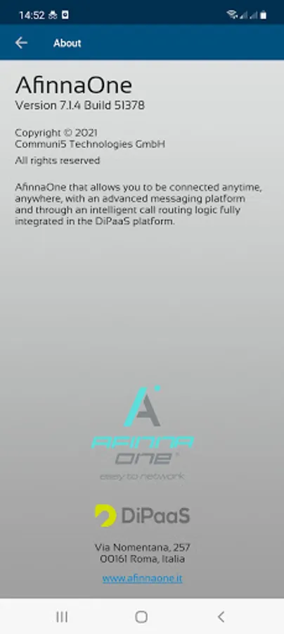 Afinna One Softphone App for Mobile takes all the functionality and features of the Virtual PBX Class 5 platform fully integrated in the Afinna One DiPaaS (Digital Platform as a Service). Afinna One Softphone App for Mobile adds a virtually universal device capability, and it is extremely easy to use it. Afinna One Softphone App is the versatile and mobile equivalent of Afinna One popular desktop version but with unique smartphone and tablet functionality. With the Afinna One Softphone App the Customer will have access to a full suite of features like having access to your full directory, viewing recent and missed calls, and even being able to use it chatting with IM capabilities and Video and conference calls. A full set of calls features (as call recording, callback, call through, call forwarding, queuing management, and many others), and calls logics are available to ensure to the user to be always reachable. Moreover, the Afinna One Softphone App is compatible with all the codecs (G.722, G.729, G.711, OPUS and many others) available in the market ensuring the best in class in terms of voice and video quality.
