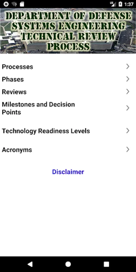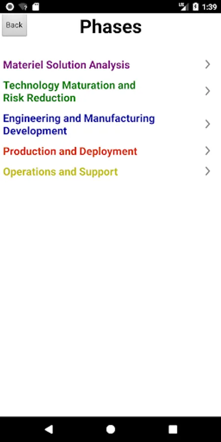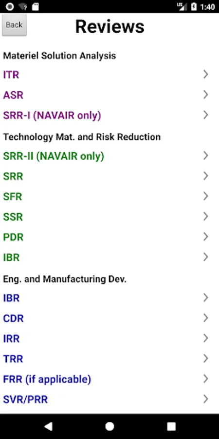 Just a couple tweaks... 1. Apple/iPhone apps look crappy on droid phones. Would be nice to have an app with a droid design, rather than an iOS port. 2. I work for the Navy in DC, so I am intimately familiar with the SE process of DoD systems/programs. In a cursory look through the app, it looks as if the Entry Criteria need to be updated. That data looks stale. Also, where are the Exit Criteria?
