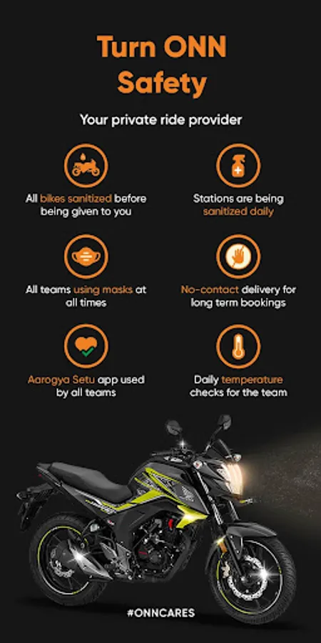 ● No ownership hassles: Forget about paying another EMI. Just pick the bike you like, and ride it anytime you need. Just like your own bike but without the hassles of maintenance, fuel, insurance, and monthly installments. Be an ONN rider today!