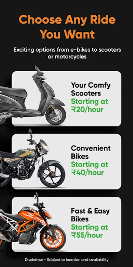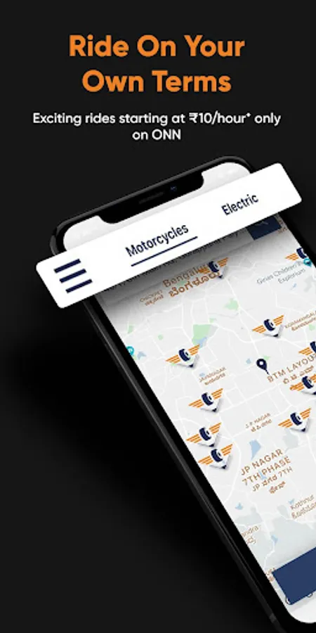 ● Schedule your booking: ONN Bikes is a modern, seamless and integrated ride sharing mobility service that allows you to block your preferred motorcycle, scooter or electric bike share well in advance.